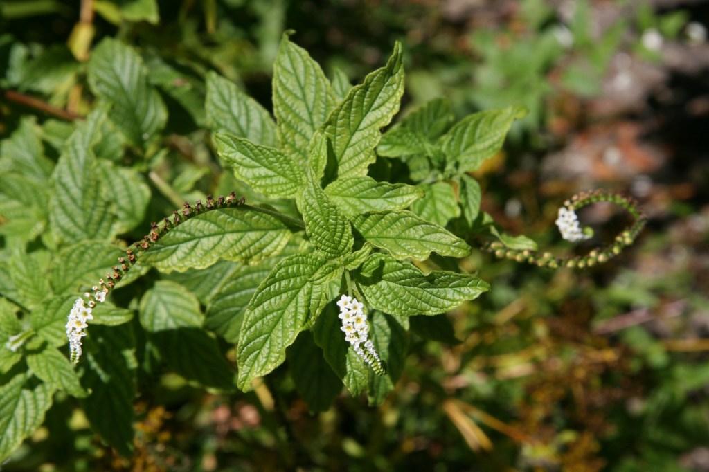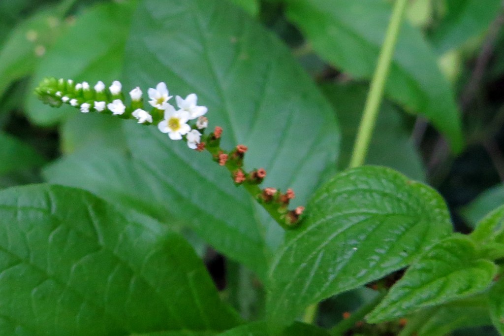 Sometimes in sunny spots at the Oslo Riverfront Conservation Area you will find scorpionstail (Heliotropium angiospermum). Coastal hammocks & strands, the edges of salt marshes, and ruderal (disturbed) areas are its home in south Florida, south Texas, the Caribbean, and south American.