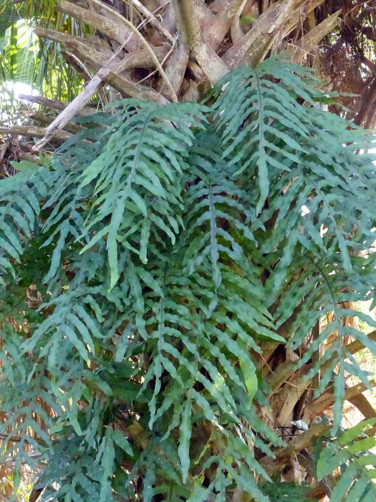 This epiphytic fern almost always grows in association with cabbage palms (Sabal palmetto). Dr Rogers pointed out that its only competitor for this locale is cabbage palm fern (Phlebdoium aureum) and that shorter “boots” (old leafstems) favor shoestring fern, while longer “boots” are more hospitable for cabbage palm fern …