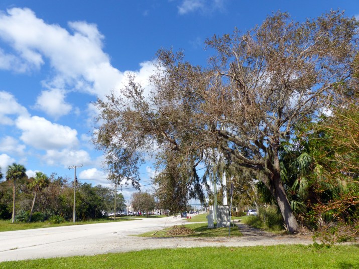 Live oak trees are well adapted to hurricanes, often shedding limbs and branches to help to withstand hurricane winds. They responded to Hurricane Irma’s handiwork by dropping all of their salt and wind scorchedeaves fell off and almost immediately replacing them with new green leaves.
