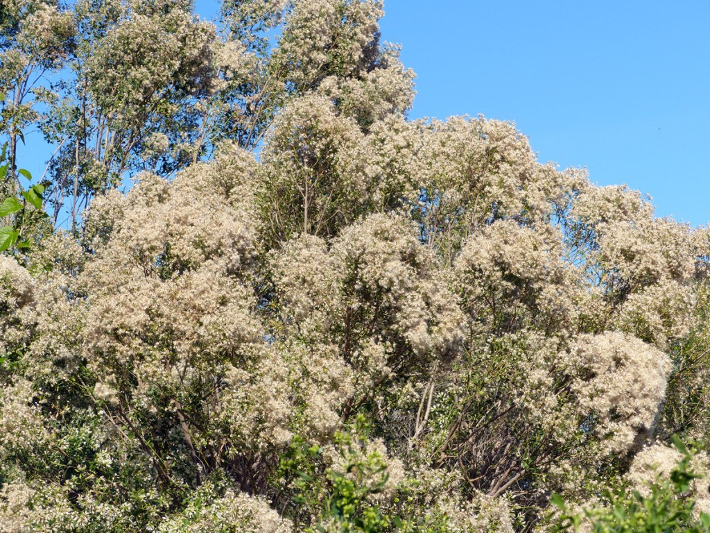 Groundsel tree is dioecious; Male and female flowers occur on different plants. Female plants (forergound) are quite showy in the fall when when they are covered with silky hairs, especially when compared to male plants (background).