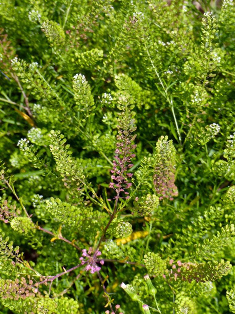 Virginia pepperweed (Lepidium virginicum) was lush and lovely at the Coastal Oaks Preserve when we visited on 2/26/2022. Native from southern Canada through most of the U.S. to central America, this wildflower can be weedy elsewhere and in its native range.