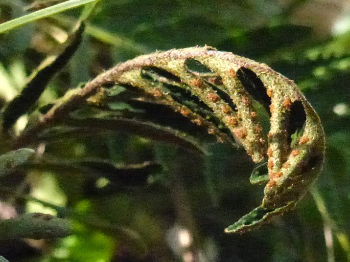 “Our” resurrection is now known as Pleopeltis michauxiana. The genus name, Pleopeltis, is derived from the Greek word pleos (many) and pelte (shield) referring the scales. The species name, michauxiana, honors 18th century French botanist Andre Michaux.