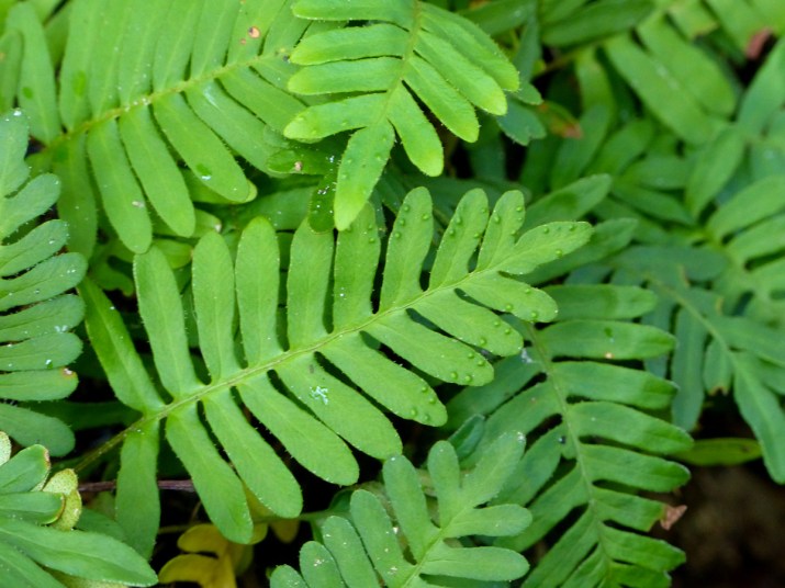 Resurrection fern has another special adaptation to drought: It can turn off photosynthesis. This ability is called poikilchlorophyll desiccation tolerance (PDT). It is regarded as an anatomically complex strategy and is thought to be the “newest” strategy of desiccation tolerance. Interesting “newness” for a fern, the plants that reigned during the time of dinosaurs.