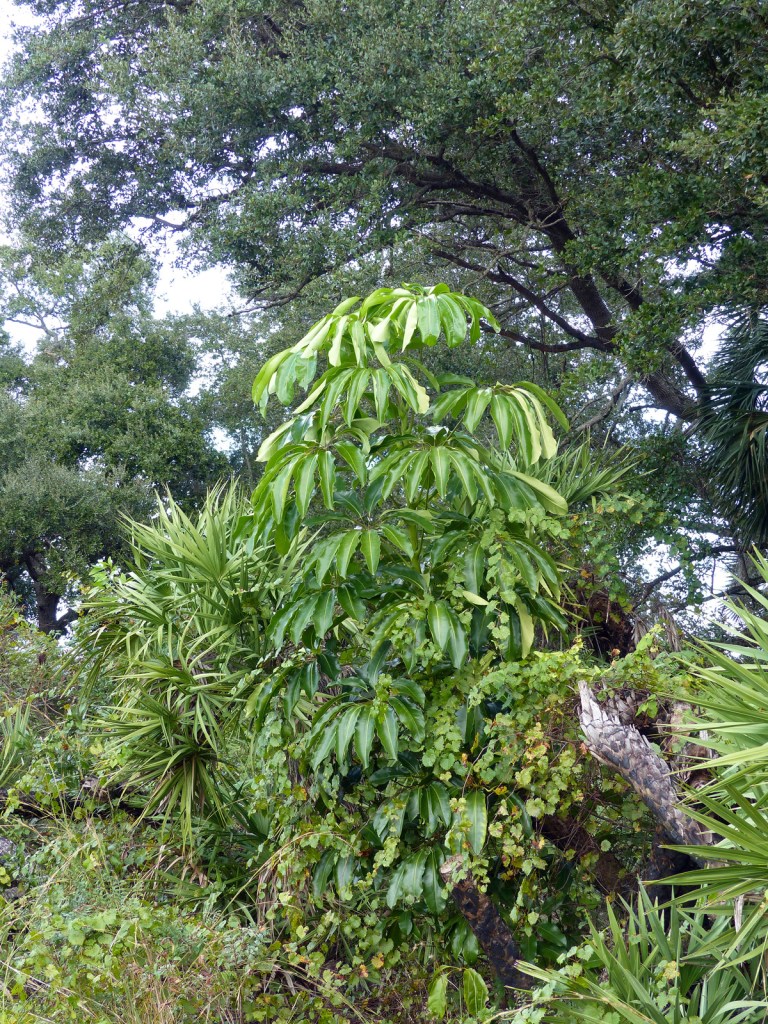 Australian umbrella tree (Heptapleurum actinophyllum), shown above at Osprey Acres Stormwater Park and Nature Preserve, is terribly invasive in south Florida. For years, most every “cookie-cutter” landscape included an Australian umbrella tree, most usually planted under the eveas of the house though its ultimate height can be 40′ tall. Other common names for this plant include umbrella tree and schefflera since its “old” botanical name was Schefflera actinophyllum.