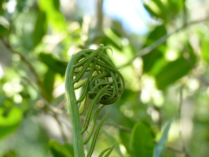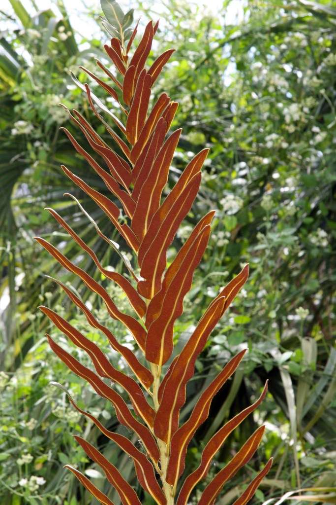 Older giant leather fern can be identified by their sheer size. They can grow to be 15’ tall and more than 6’ wide. Non-fertile fronds have coarse, leathery leaflets that are dark green above and paler green below. One of its ascending or arching fronds can have 20 to 60 individual leaflets. Like all ferns, the fronds of giant leather ferns begin as fiddleheads, coiled up fresh fronds.