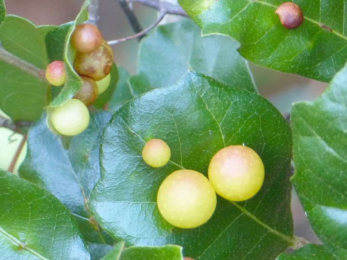 These detachable, hairless globular galls can be brown, orange, yellow, red, or some combination thereof in color. You will find them on the upper side of the leaf, the lower side of the leaf, and on the leaf midrib. ID was made possible by the gallmakers.org website.