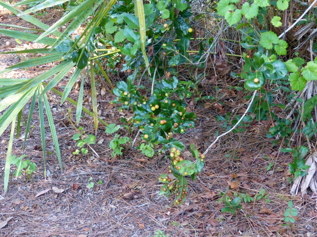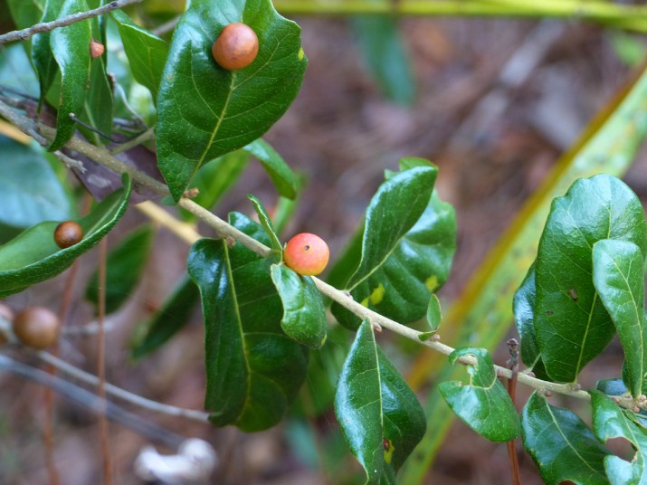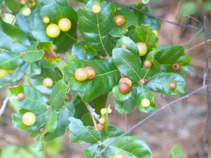 When we visited the South Oslo Riverfront Conservation Area (SORCA) on 6-18-2002 to check out the blooming Florida butterfly orchids, we also saw this collection of small, round galls growing on Chapman oak (Quercus chapmanii). These adorable galls are the handiwork of a tiny gall wasp (Trigonaspis polita). These galls are the asexual (agamic) stage. More about that later.