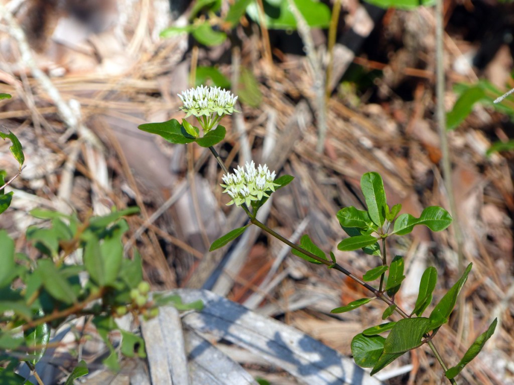 Another endemic white-flowered milkweed is found in Indian River County: Florida milkweed (Asclepias faeyii). Also called Faey’s milkweed, this uncommon perennial plant occupies a niche space between mesic and scrubby flatwoods in south and south central Florida and is shown below at Sebastian Harbor Preserve. As with Curtiss’ milkweed, the white flowers of Florida milkweed, shown below, are held in an umbel. The flowers of Florida milkweed have a distinctive dark magenta center where the pistil and stamen are held. Viewed from above, the petals point outward giving each flower a star-like shape …