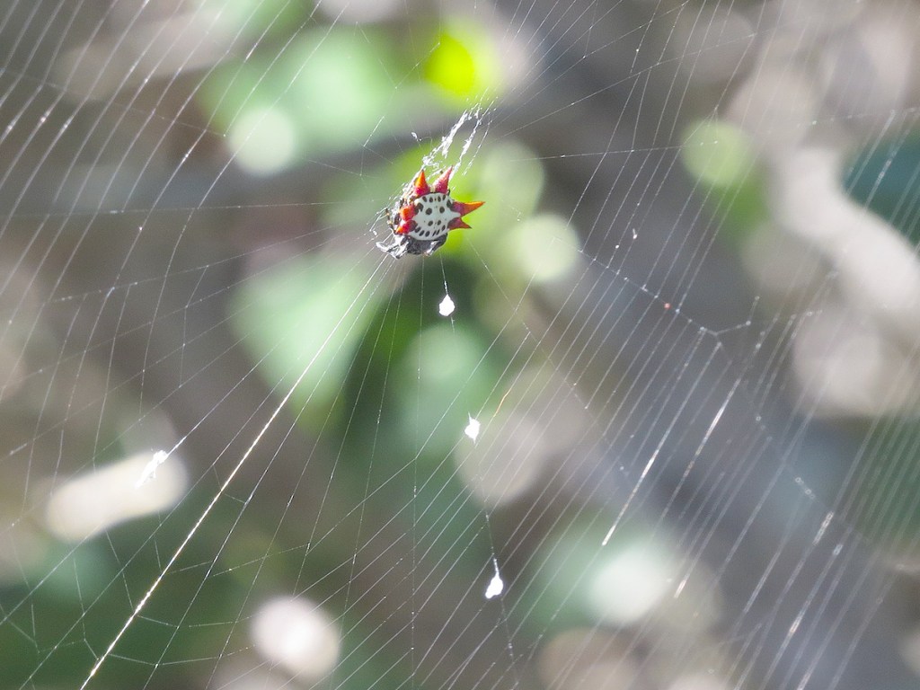 Female spineybacker orbweavers can be up to 1/2″ wide and 1/3″ tall. The top of the abdomen (dorsum) is white with black spots with 6 red pointed abdominal projections called spines.
