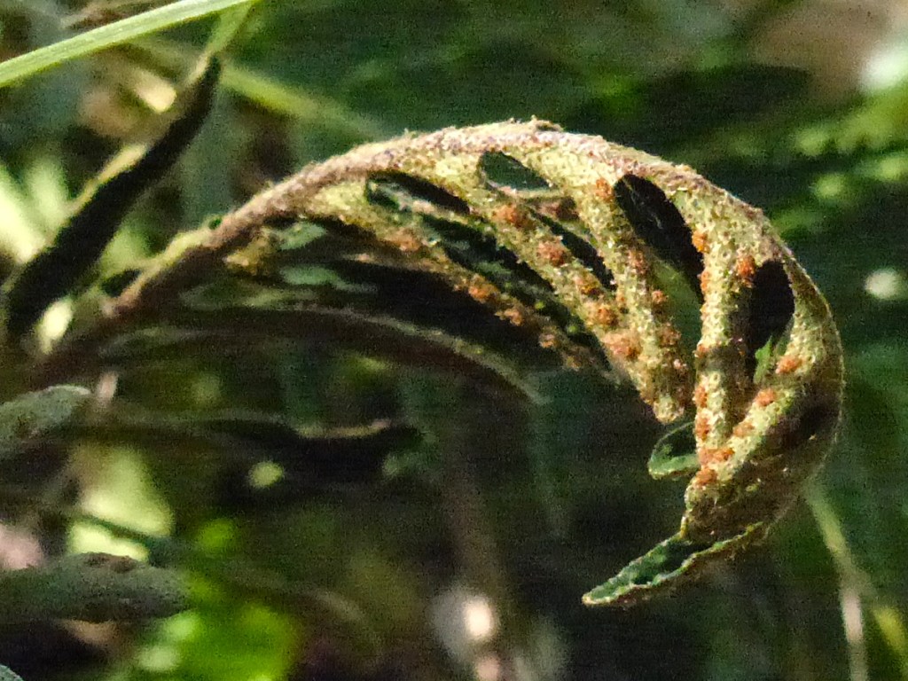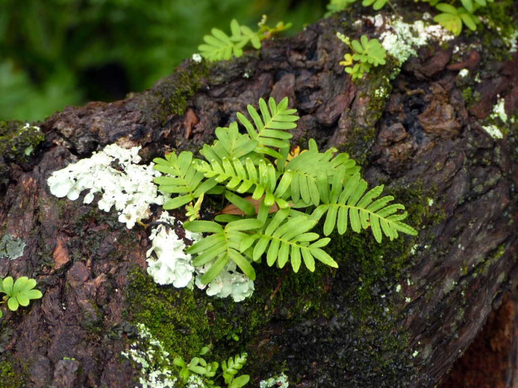 The scientific name for resurrection fern once was Polypodium polypodioides, and you still will see that “old” name in use in older texts and on the web. The next scientific name given to this fern was Pleopeltis polypodioides. That name now is associated with tropical resurrection fern, which is known from only one population in Florida located on Key Largo. Tropical resurrection fern is distinguished from “regular” resurrection fern by the presence of scales on the top (adaxial blade) of its fronds.