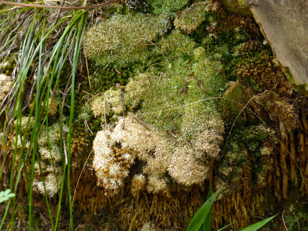 The decaying boots (old leafstems) of the cabbage palms are thought to provide some nutrients to this amazing epiphyte. Dr. George Rogers, who recently retired as the Botany Department Chair at Palm Beach State College, has noted that in sunnier locations shoestring fern is associated with light-colored moss that he describes as a “white-toned, thick, pillowy, absorbent moss (Octoblepharum albidum)“.