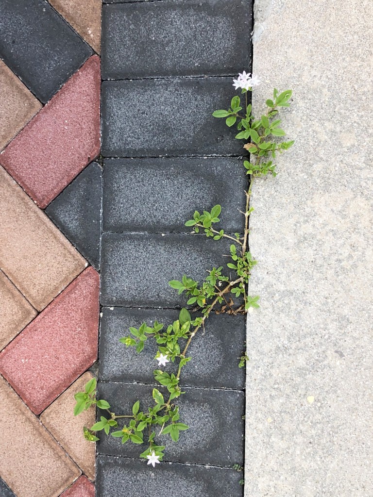 This perennial weed often forms a dense mat and is difficult to eradicate due to its deep central taproot, extensive rhizomes, and its ability to root from stem fragments and seeds. It is quite tolerant of tough conditions, as you can see from the photo below taken at the entry to Bruno’s Chocolate Factory …