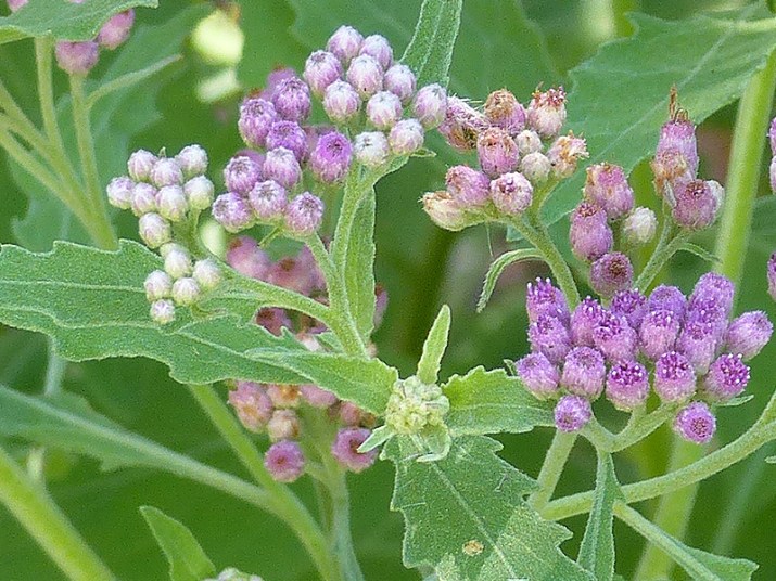 Sweetscent (Pluchea odorata) is a native wildflower of moist places (brackish or fresh) that has a variety of other common names including camphorweed, stinkweed, salt marsh fleabane, sourbush, and cattle-tongue. Many of its common names refer to the sweet-spicey-musky fragrance emitted by the leaves when crushed. Pioneers used dried aromatic leaves to repel fleas and other insects (i.e., a fleabane).