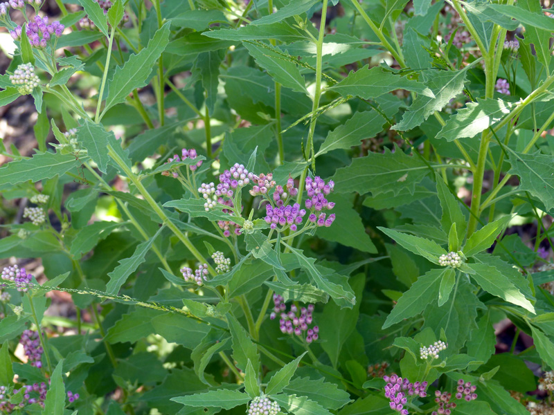Its alternate leaves are rough to the touch, elliptical in shape, have toothed edges, and can be from 2 – 6″ long. The fragrant pinkish flowers are held in a flat topped cluster (cyme) and attract butterflies, skippers, and a wide variety of native bees including leaf cutter bees, sweat bees, and carpenter bees.