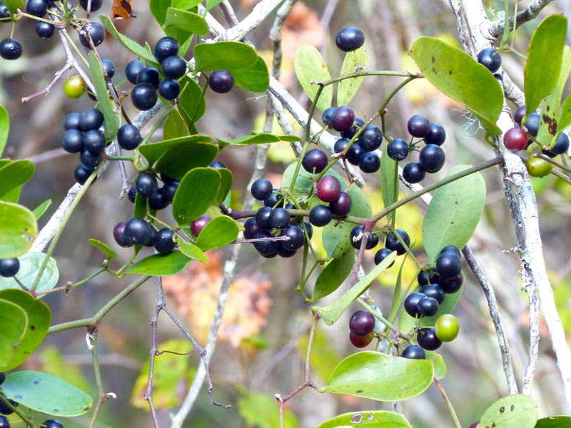 Wildlife enjoys eating these single-seeded fruits. Tangles of thorny laurel greenbrier vines provide a wonderful protected place for wildlife to hide out.