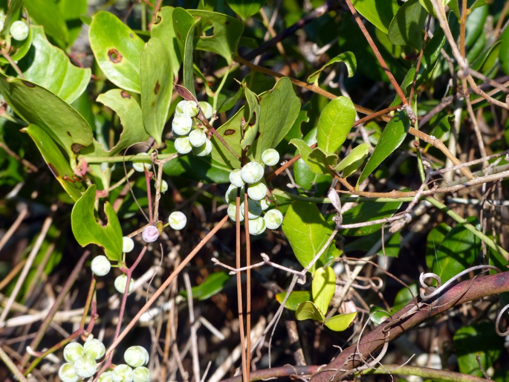 Laurel greenbrier (Smilax laurifolia) also is called bamboo vine. One of three species of greenbrier vines in Indian River County and at the Oslo Riverfront Conservation Area, laurel greenbrier is found in moister locations, including areas that experience extended periods of inundation.