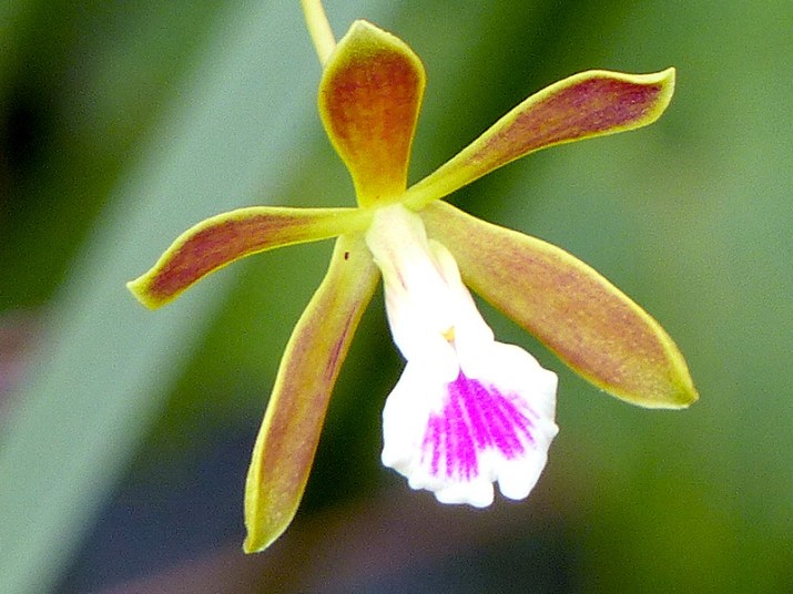 Its flowers have 5 tepals that surround a white lip with a purple spots, stripes or splotches. The tepals can be quite variable in color: greenish, yellow, bronze, copper …