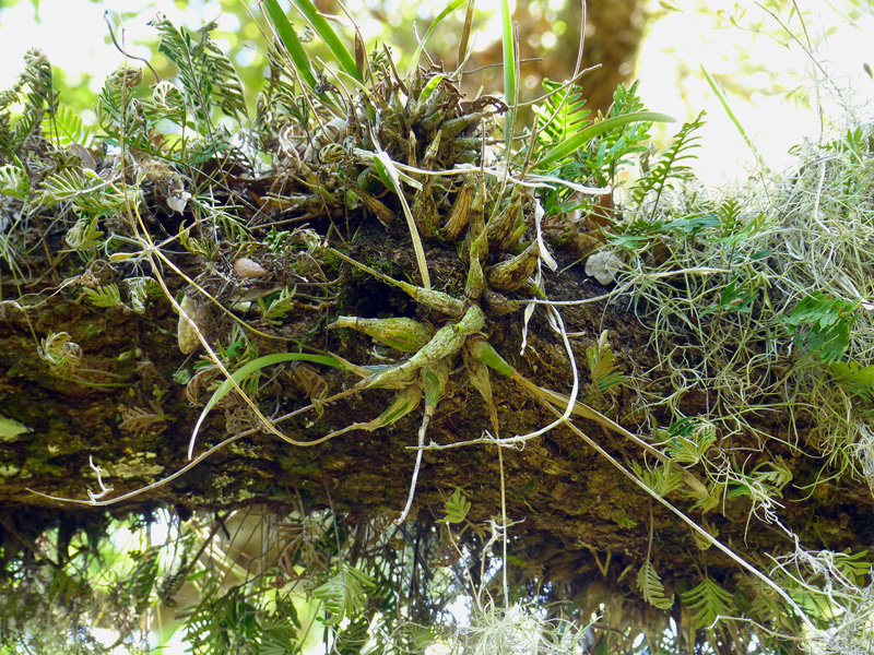 When not In flower, this orchid is easy to overlook. Its grass-like strappy leaves blend with other epiphytes including resurrection fern (Pleopeltis polypodioides), Spanish moss (Tillandisa usneodies), and southern needleleaf (Tillandsia setacea).