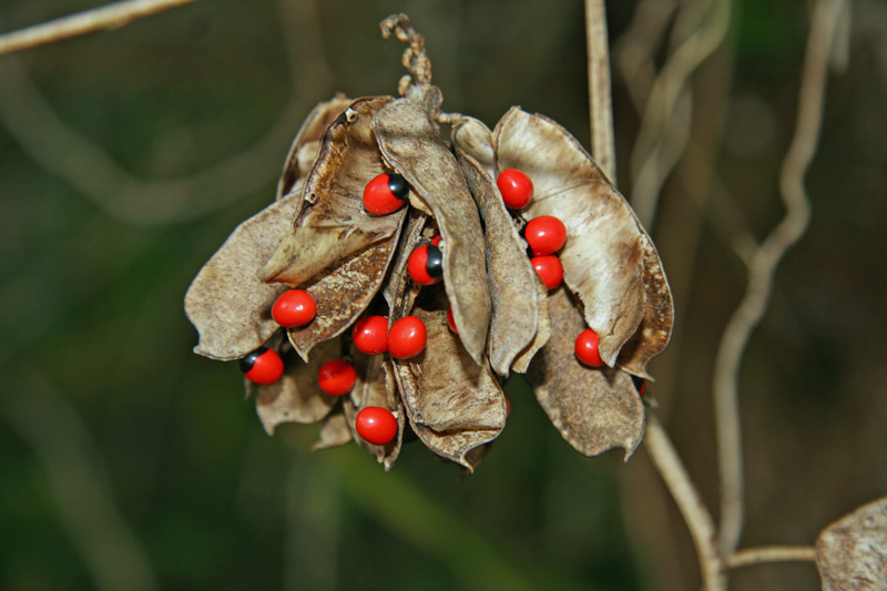 Each seed has a black spot where it attaches to its seed pod, The black spot gives rise to the common name crab’s eye. Other common names refer to its use for jewelry and prayer beads and include Indian bead, jequerity bean, prayer bean, precatory bean, Seminole bead, and Buddhist rosary bead.