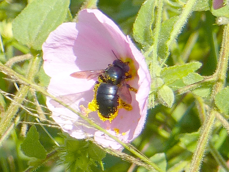 Its pale pink flowers are about 3″ in diameter and sport a central column of yellow stamens.