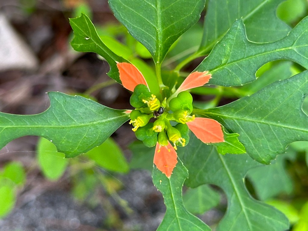 Paintedleaf is very variable: Not only in the color of the bracts but in the shape of its leaves. Its leaves can be narrow and linear, oblong, fiddle-like, lobed, or toothed. Most of its leaves are alternate, but the bottom and top leaves can be opposite. This self-seeding wildflower grows to be about 2’ tall, and its upright stems contain a white, milky sap that can be irritating, as do many other members of the spurge family, Euphorbiaceae.