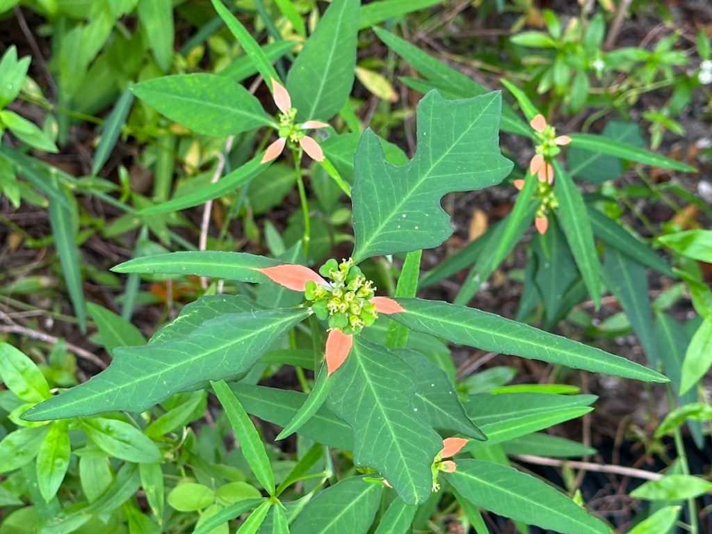 In Florida, paintedleaf grows in hammocks, in pine flatwoods, and especially in disturbed places. You may discover it growing in your yard. Like its well-known celebratory kin, the “real” poinsettia (Poinsettia pulcherrima), paintedleaf has showy colored bracts (modified leaves) and tiny flowers. The dramatic bracts of the cultivated “Christmas” poinsettia, a native of Mexico, are much, much larger and more colorful.