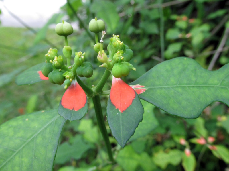 Fire-on-the-mountain, Mexican fire plant, wild poinsettia, dwarf poinsettia, painted poinsettia, and Florida poinsettia are other common names for this plant. Its eye-catching bracts can be splotched with red, pinkish or whitish “decorations”.