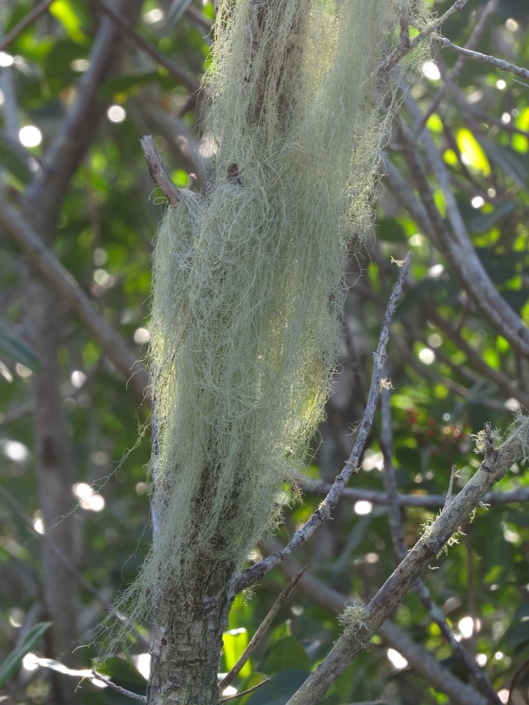 Beneath the silvery hairs is a wiry black “core”. Once upon a time, Spanish moss was an item of commerce. It was harvested and dried so that the inner core could be used to stuff mattresses and upholstered items. It was far softer than horse hair, which was used for similar purpose.
