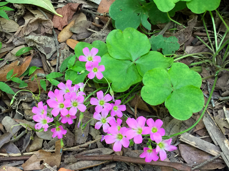 Pink woodsorrel (Oxalis debils var. corymbosa), a non-native perennial wildflower, seems to come and go around here (but not everywhere). Over the years, we have seen it growing in the shade at the entrance to the Oslo Riverfront Conservation Area and more recently on the edges of a shady moist hammock at the Coastal Oaks Preserve. According to the Center for Regional Conservation, pink woodsorrel is “sparingly naturalized” in many south Florida conservation areas.