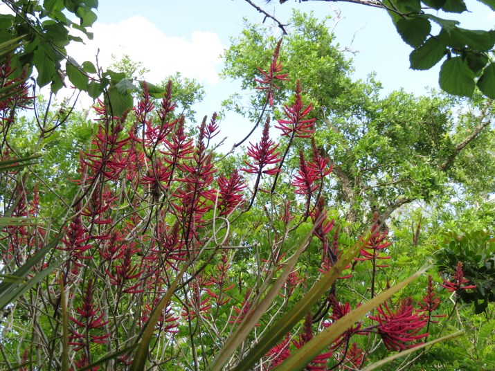 Take a ride now – the beginning of April – on Highway A1A in the vicinity of Sebastian Inlet State Park, and you will see lots of coralbean flowers rising up from the saw palmetto (Serenoa repens) and other vegetation.