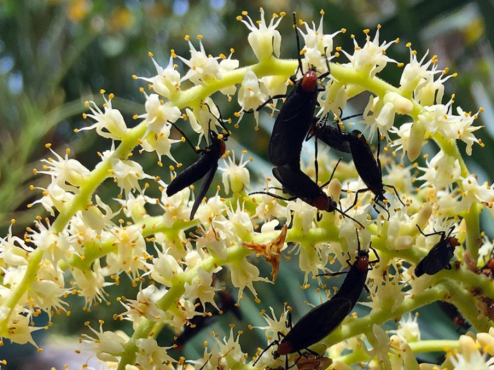 Lots of insects visit the sweetly fragrant flowers of saw palmetto (Serenoa repens) including lovebugs (Plecia nearctica). Lovebugs emerge in large numbers twice a year: Late spring (April/May) and fall (August/September).