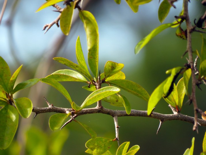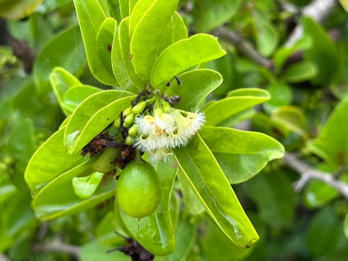 Another native plant with seeds that float for long distances is tallow wood (Ximena americana). You will find this plant growing in sandy places – both beach and scrub. Inside the delicious, fragrant fruit is a seabean, a seed that is capable of floating on ocean currents. Enjoy the pulp but avoid eating the seed, which has purgative properties. Hence, this plant also is called purge nut.