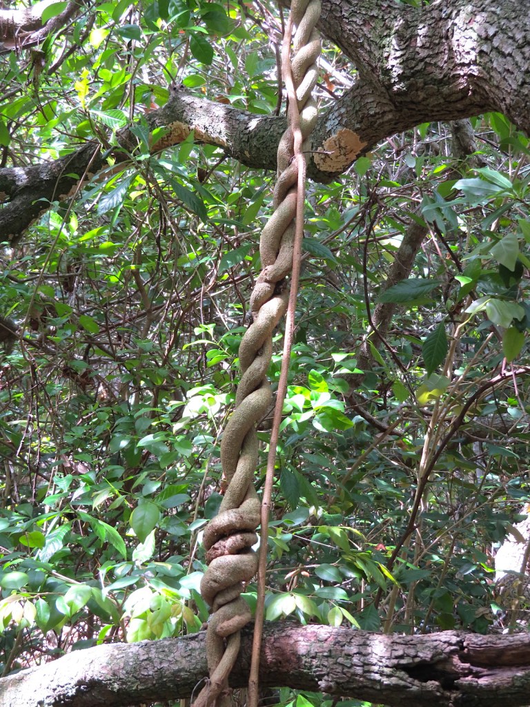This fast-growing vine is perennial and long-lived. Over time it develops a distinctive twisted structure, as shown below in the hammock area at the Brevard Barrier Island Sanctuary and Education Center growing toward the sun through the branches of live oaks (Quercus virginiana) on a walk in 2014 led by Karen Schuster (Class of 2009) …