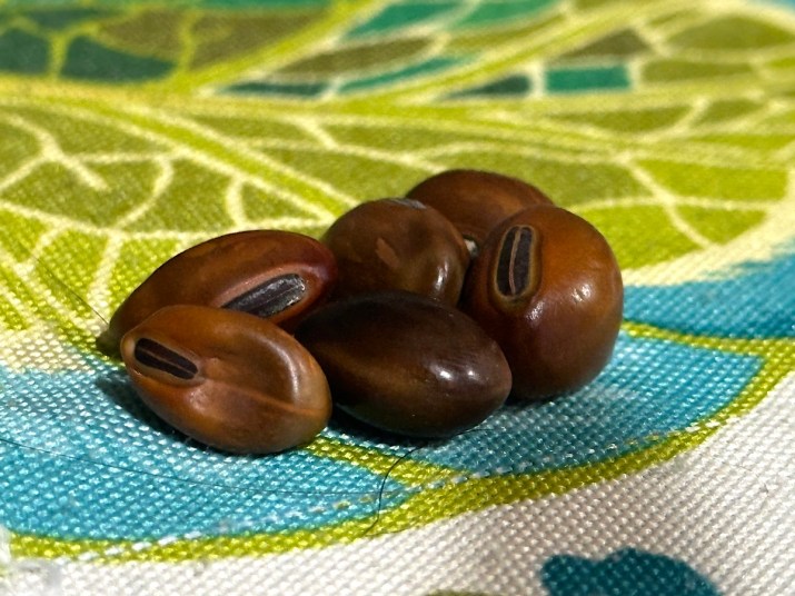 They split length-wise to release brown, shiny seeds. Note the conspicuous hilium, the mark left on the seed coat where the seed attached to its pod, a characteristic of plants in the pea family (Fabaceae) …