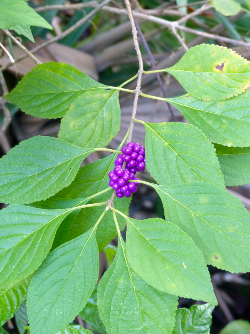 - the tiny magenta fruits encircling the stems of the aptly named beautyberry (Callicapra americana)