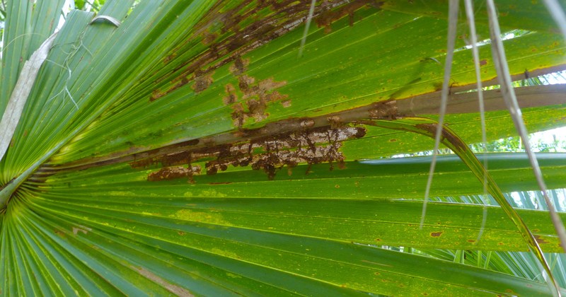 Some of the fronds of cabbage palm (Sabal palmetto) at Oslo Riverfront Conservation Area (ORCA) show signs of the handiwork of the native palm leaf skeletonizer (Homaledra sabalella). This pest plagues native palms including cabbage palms and saw palmettos (Serenoa reopens ,…