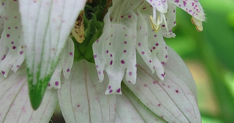 What appear to be petals on this bee balm (Monarda punctuata) are really bracts (modified leaves usually associated with a reproductive structure). The flowers themselves are white with purple dots, giving rise to common names like spotted bee balm and…